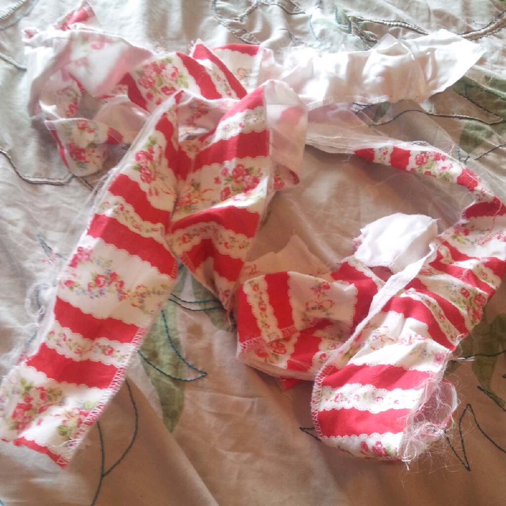 The second piece is a bit more interesting. The pattern is AMAZING, this beautiful Cath Kidson-esque stripy floral design. It also measures up at 7cm wide and OVER THREE METRES long. Whaaat the hell was I going to do with it? It's also overlocked down the one edge, with a shiny, synthetic lining still attached to it.